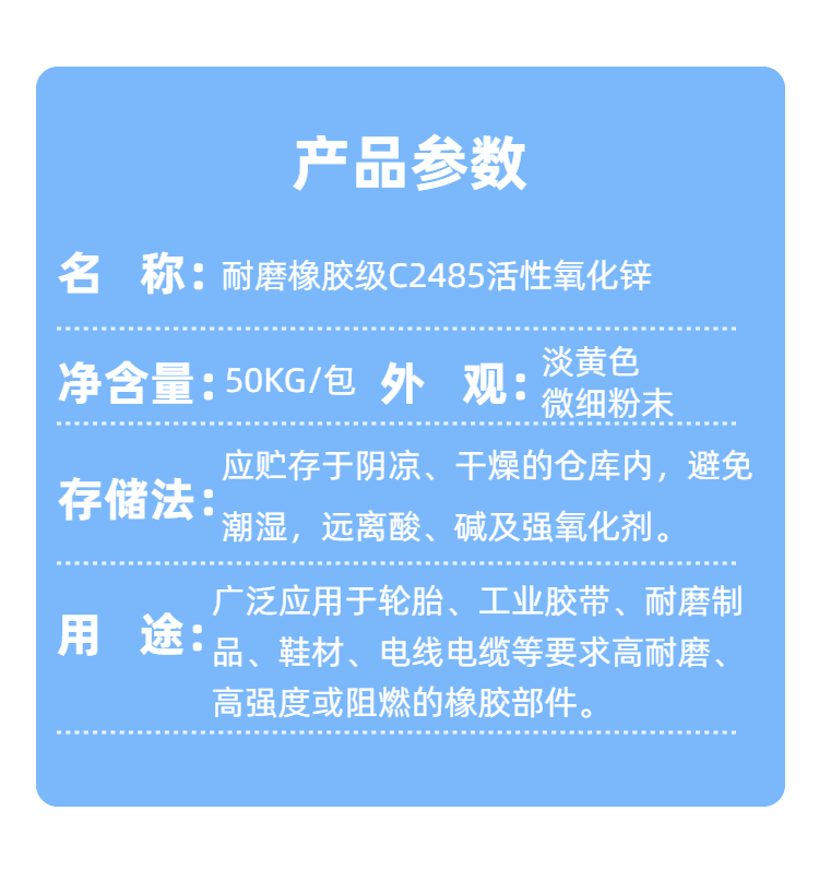 本品為橡膠工業(yè)設(shè)計的高活性氧化鋅,型號C2485,專門用于提升高性能橡膠制品的耐磨性、力學(xué)性能及硫化效率。采用特殊工藝制備,具有高表面活性和良好的分散性,適用于對耐磨性能有較高要求的橡膠制品。