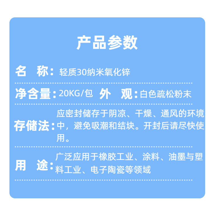 本產(chǎn)品是由肇慶市新潤豐高新材料有限公司采用低溫可控化學(xué)沉淀法制備的高純度納米氧化鋅。其平均一次粒徑嚴(yán)格控制在30納米左右,具備典型的六方纖鋅礦晶體結(jié)構(gòu)、高比表面積及良好的分散性能。產(chǎn)品為白色疏松粉末,廣泛應(yīng)用于橡膠、涂料、塑料、陶瓷等領(lǐng)域,作為高性能功能性添加劑,可顯著提升終端產(chǎn)品的力學(xué)性能、抗菌性、紫外屏蔽性和電學(xué)特性。相較于10納米產(chǎn)品,本產(chǎn)品在保證優(yōu)異性能的同時,具有更好的性價比。